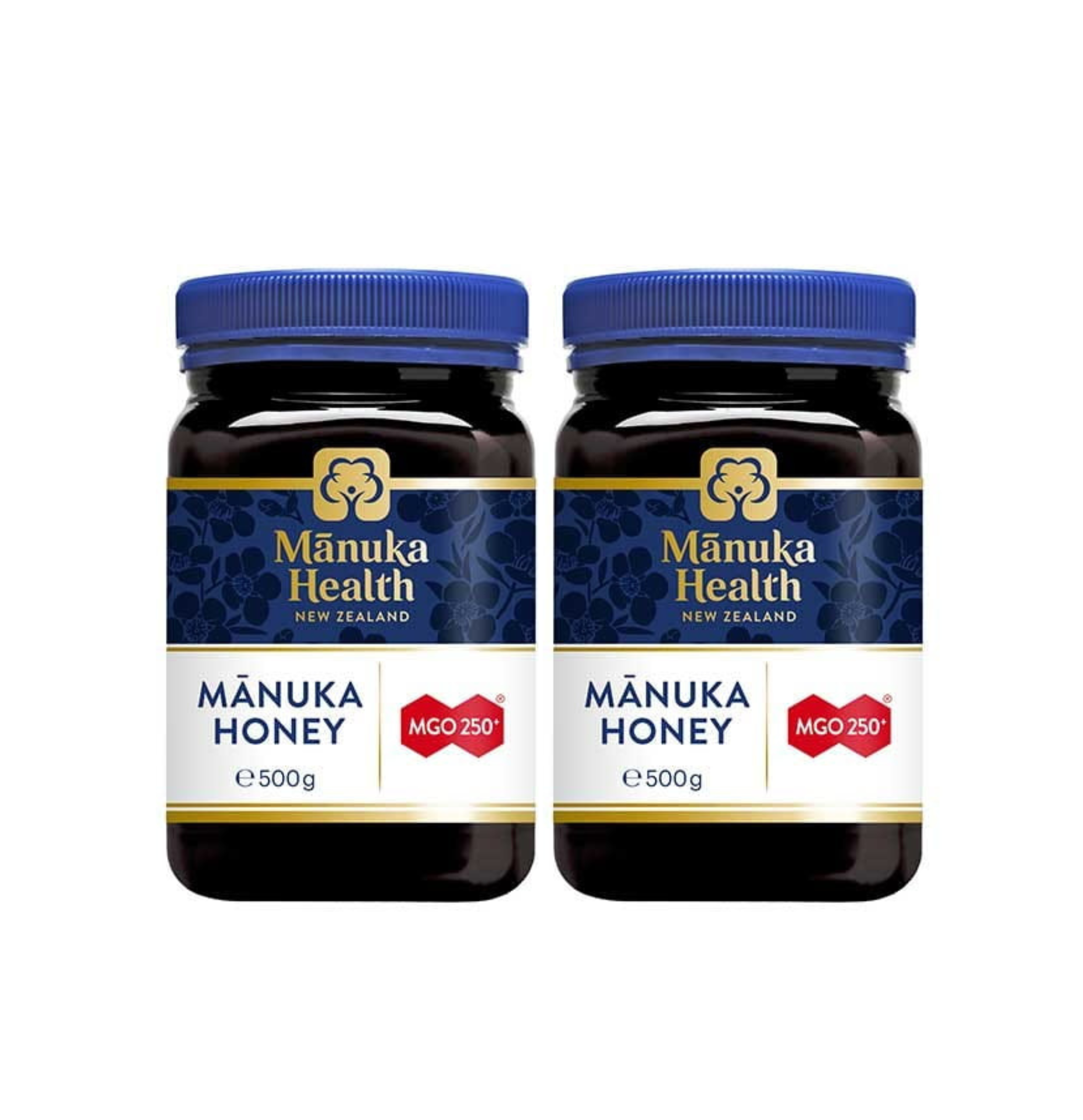 Zestaw zawiera dwa słoiki miodu manuka 250+ każdy o pojemności 500g.