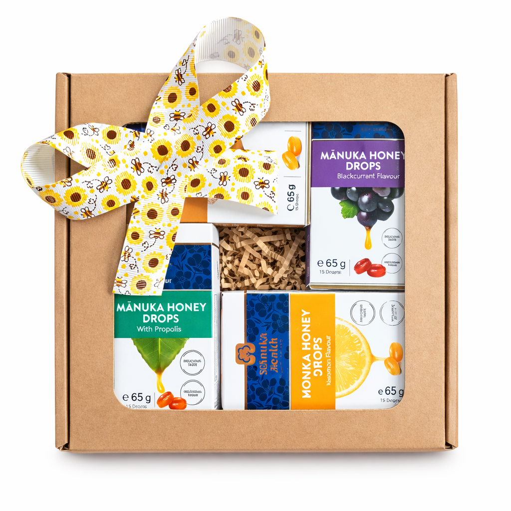 Zestaw cukierków Manuka to naturalna propozycja dla osób, które chcą wspierać gardło i odporność w smaczny sposób. W opakowaniu znajdują się cztery różne smaki cukierków z dodatkiem miodu Manuka, cenionego na całym świecie za swoje właściwości.