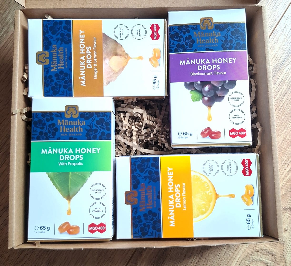 Zestaw cukierków Manuka – 4 smaki (Propolis, Cytryna, Imbir i Cytryna, Czarna Porzeczka)